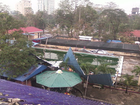 | mái che của bể bơi nhà văn hóa thiếu nhi Nam Định bị đổ sau bão Son Tinh vẫn chưa được sửa lại |